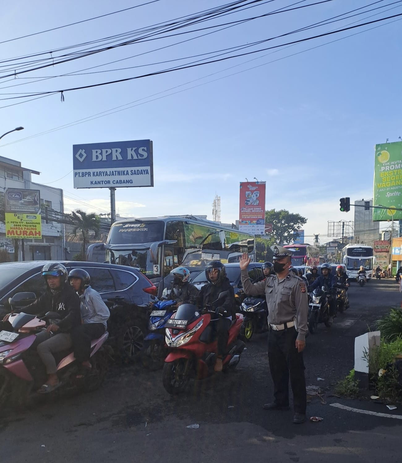 Antisipasi kemacetan pagi hari, personil lalulintas Polsek Sukasari melaksanakan pengamanan jalur di titik rawan kemacetan Wilayah Hukum Polsek Sukasari Polrestabes Bandung.(4/10/2025)