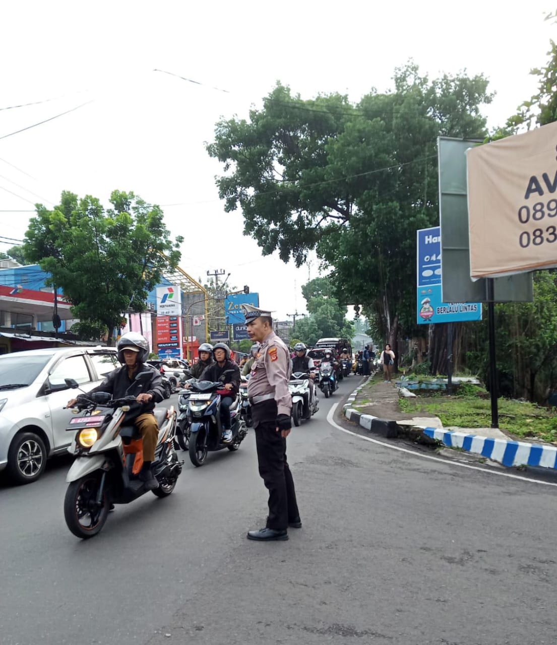 Personel lalulintas Polsek Arcamanik melaksanakan pengaturan antisipsi kemacetan pada pagi hari