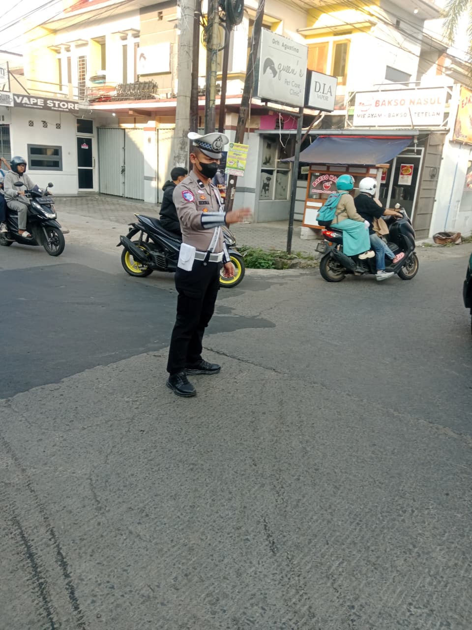 Personel lalulintas Polsek Arcamanik melaksanakan pengaturan antisipsi kemacetan pada pagi hari